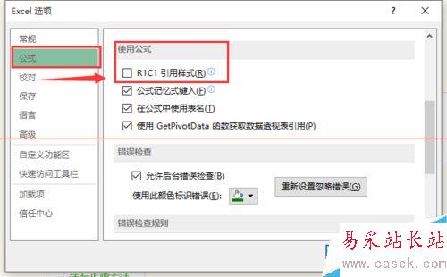 7、按照步驟3,再次進入“文件”→“選項”,找到“公式”,依舊下拉滾動條,將其下拉,并找到“使用公式”,其中有一項叫“R1C1引用樣式”,將其前面的勾取消掉,即可大功告成。