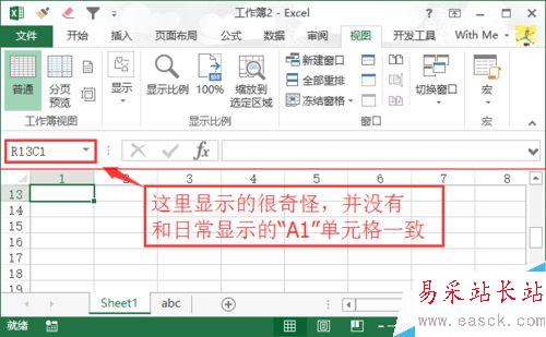 6、設置完成,有一個地方很奇怪,日常使用單元格的時候,我們常常會看到A1,A2這樣的,可恢復后,看到Excel顯示R1C1類似這樣奇怪的字符。
