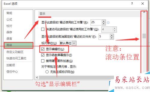 3、功能區工具欄已經恢復,接下來點擊Excel左上角“文件/圓形按鈕”,在彈出菜單中,點擊“選項”,在彈出的窗口中,點擊左側“高級”,將滾動條向下滾動,找到“顯示”,將“顯示編輯欄”勾選上,可恢復編輯欄。