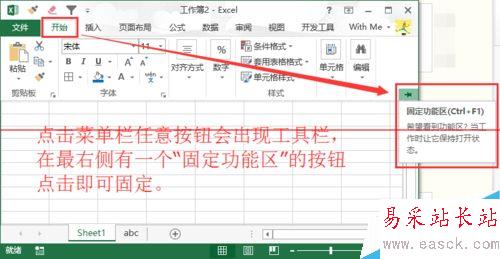 2、點擊菜單欄任意按鈕會出現工具欄,在最右側有一個“固定功能區”的按鈕點擊即可固定。