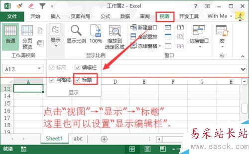 5、再次點擊菜單欄的“視圖”,找到“顯示”并單擊其中的“標題”即可正常使用。在這里也可以設置“顯示編輯欄”。