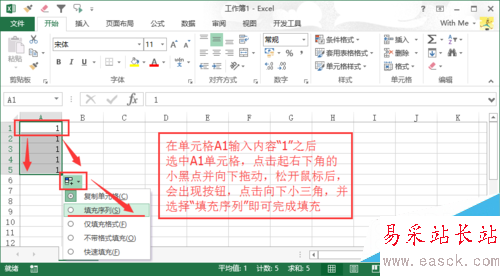 第三步:返回Excel主界面后,在單元格A1輸入內(nèi)容“1”之后,選中A1單元格,點(diǎn)擊起右下角的小黑點(diǎn)并向下拖動(dòng),松開鼠標(biāo)后,會(huì)出現(xiàn)按鈕,點(diǎn)擊向下小三角,并選擇“填充序列”即可完成填充