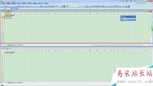 3、在打開的窗口的右上角分別有兩個“最小化“、”還原“和”關閉”三個選項;(這說明兩個excel工作表都顯示在同一個大的窗口內)