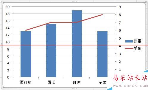 9、設置后圖表樣子,大功告成。成功設置柱狀圖和折線圖在同一個圖表上了。