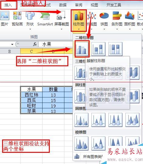 3、添加圖表,“插入”→“柱狀圖”→“二維柱狀圖”