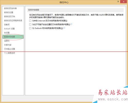 3、點擊左側的“受保護的視圖”,然后把右邊三個框內的勾全部去掉,最后點擊確定。