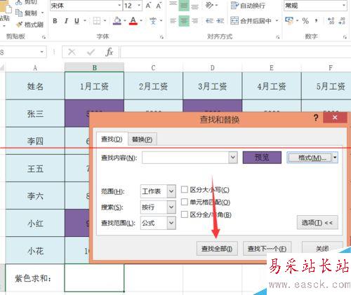 6、選擇確定按鈕后會回到查找對話框,此時我們單擊對話框上的“查找全部”選項。