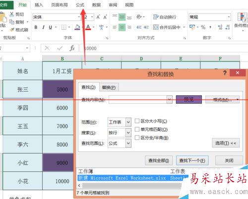 7、然后就會將單元格里面所有紫色的單元格都查找出來了,此時我們將查找的選項全部選上,單擊第一個查找出來的選項,然后按下“shift”,再單擊查找出來的最后一個選項就可以將查找出來的選項全部選上。都選擇好之后我們單擊菜單欄里的“公式”按鈕。