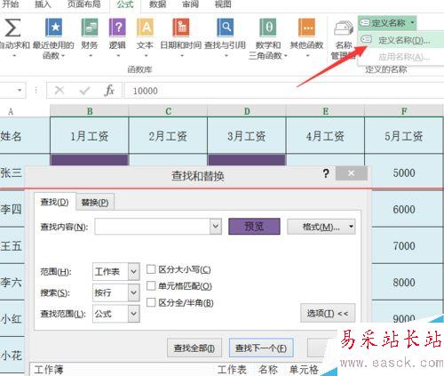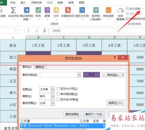 8、單擊公式按鈕后會進入到如圖,此時我們單擊面板上方”定義名稱“后方的小三角形。
