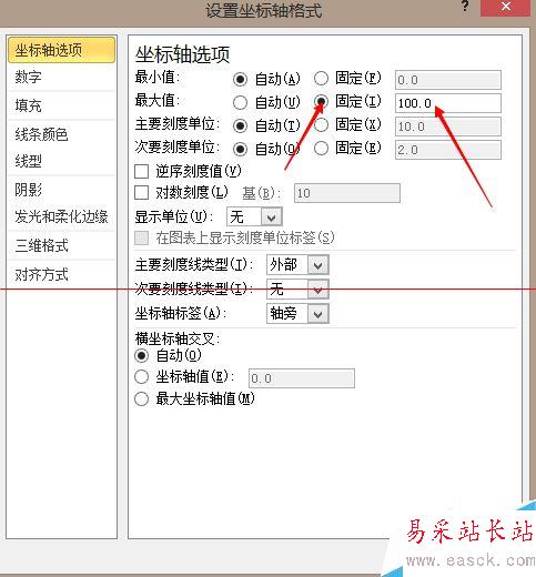 9、將坐標軸選項的最大值改為固定100,點擊右下角關閉