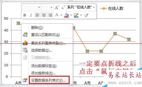 4、這一步最重要,不然后面的設置會出不來效果。在折線圖上點擊“鼠標左鍵”→選中折線之后,在右鍵選擇“設置數據系列格式”: