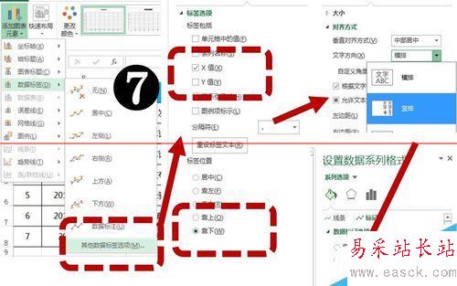 2)彈出的對話框?qū)?ldquo;標(biāo)簽包括”Y值改為“X值”;“標(biāo)簽位置”為“靠下”;文字版式中的“文字方向”為豎排;將“數(shù)據(jù)標(biāo)記類型”選擇“無”。