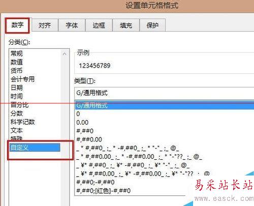 3、在選項(xiàng)框中的最上面的菜單中,選擇“數(shù)字”,然后在其對應(yīng)的菜單下,選擇“自定義”選項(xiàng)。之后就看到右邊的方框選項(xiàng)。