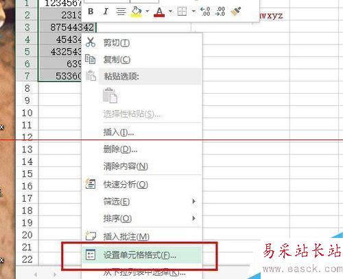 2、用鼠標(biāo)選中你的輸入的幾個(gè)數(shù)據(jù)的單元格,然后單擊鼠標(biāo)右鍵,在彈出來的菜單中,找到“設(shè)置單元格格式”選項(xiàng),然后單擊它,會彈出來另一個(gè)選項(xiàng)框。