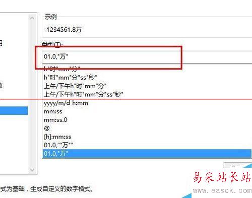 4、在右邊的“類型”選項(xiàng)的下面的輸入框里,刪除原來的文字,然后輸入“01.0,萬”這幾個(gè)字和數(shù)字就行了,注意引號不用輸入哈。