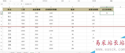 6、在應交所得稅列輸入公式 =D2*E2-F2 ,即表示計算應交所得稅(應納所得稅額×稅率-速算扣除數)。下拉填充即可得到所有的應交所得稅了。