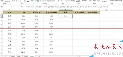 4、在稅率列輸入=IF(D2<=1500,0.03,IF(D2<=4500,1,IF(D2<=9000,0.2,IF(D2<=35000,0.25,IF(D2<=55000,0.3,IF(D2<=80000,0.35,0.45))))) ),判斷應納稅所得額的在哪一個層次。對稅率列的數字設置成百分比顯示,下拉填充。
