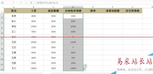 3、在應納稅所得額列輸入=IF(B2-C2>0,B2-C2,0),表示如果工資大于起征點(即工資-起征點>0),則計算應納稅所得額,否則為0 。下拉填充應納稅所得額欄。