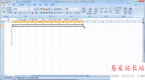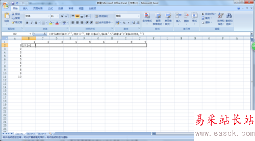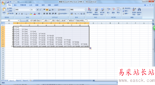 4、現(xiàn)在就在B2單元格中輸入“  =IF(AND($A2<>"",B$1<>"",B$1<=$A2),$A2&"×"&B$1&"="&$A2*B$1,"")  ”