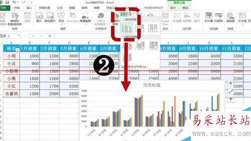3、創建銷售柱形圖:選擇數據單元格,菜單欄選擇“插入”——柱形圖——簇狀柱形圖,這樣就繪制了一個基礎圖表,操作很簡單,一帶而過,相信大家這一步都很熟練了。