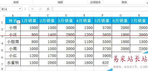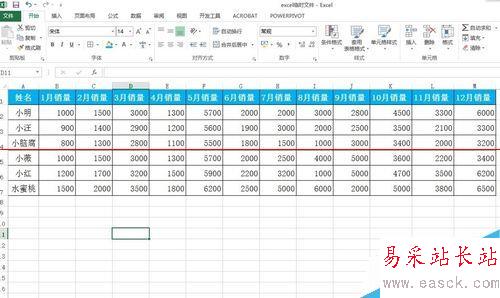 1、如下圖所示,我們給到一個銷售數據基礎表,里面包含了積分銷售人員全年的銷售數據。我們接下來就要做到,實現想看那個銷售員的數據時,只顯示他的銷售圖表,其他人暫時隱藏,下面的柱形銷售圖也是跟著變化的。