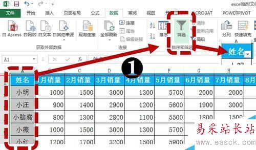 2、首先,為“姓名”這一列創建篩選功能:選擇A列數據,菜單欄“數據”——篩選;這樣“姓名”單元格右下角就會出現一個下拉按鈕了。