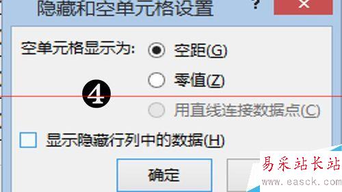 2)在彈出的對話框中,點擊左下角的“隱藏單元格和空單元格”按鈕,然后“顯示隱藏行列中的數據”前面不要打勾。