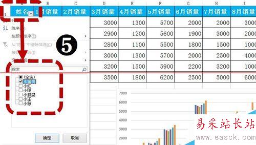 5、應用篩選操作:點擊“姓名”單元格右下角下拉框,可以看到默認勾選的是所有銷售人員,這時只需要將需要顯示的打勾就可以了。接下來會看到銷售,其他人的銷售數據會隱藏,柱形圖也只顯示她自己的。