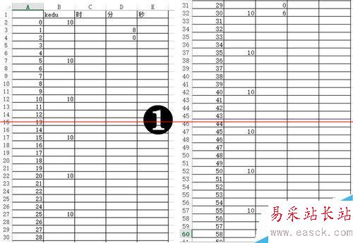 繪制一個表格,如圖所示,A列表示時鐘轉一圈60分鐘,每分鐘的刻度(0到59);B列表示12個小時的刻度(每5行一個數值);C/D/E分別代表時/分/秒。