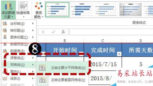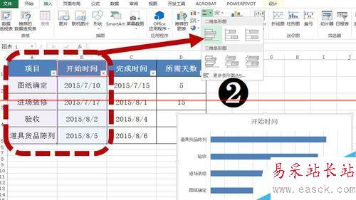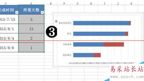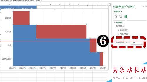 1)選中“所需天數(shù)”(紅色條塊)——設(shè)置數(shù)據(jù)系列格式——將“分類間距變?yōu)?;