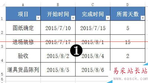 1、案例:假設(shè)店鋪開業(yè)需要經(jīng)過圖紙確定、進(jìn)場(chǎng)裝修、驗(yàn)收合格、道具貨品陳列幾個(gè)步驟,我們按照這個(gè)過程,先做出基本表格(如下圖所示);