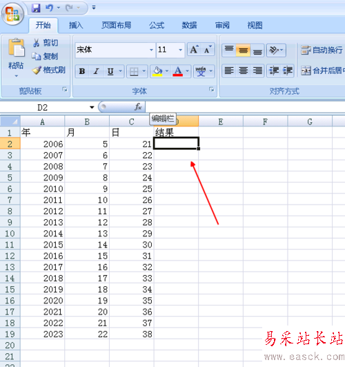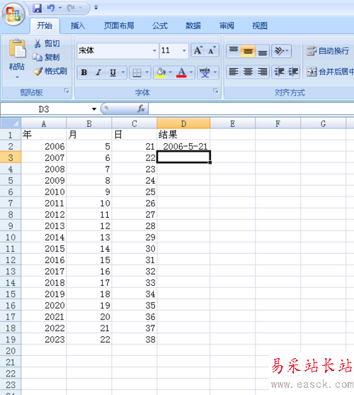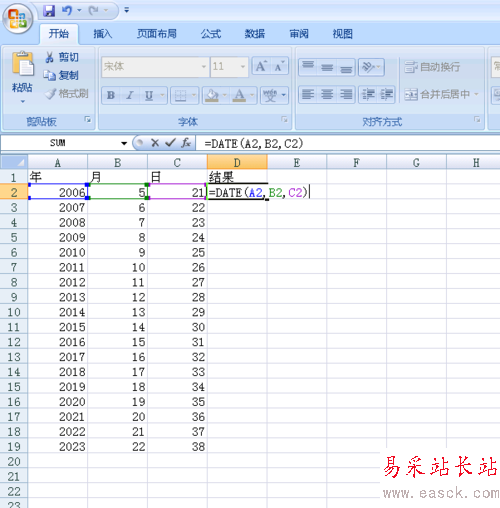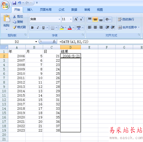 4、然后我們在這里輸入“=DATE(A2,B2,C2)”,我們的數值轉換為日期顯示了,只是這塊使用了函數,那下邊怎么辦呢