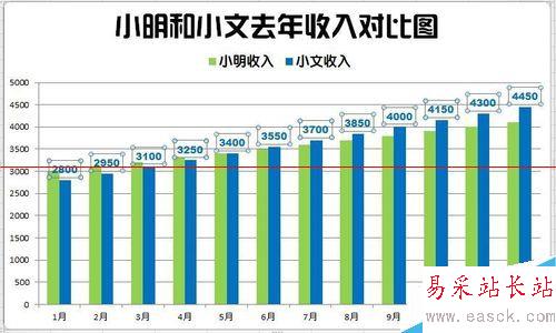 6、設(shè)計數(shù)據(jù)標(biāo)簽。每一張圖都有想說明的重點,所以不必將每個系列的數(shù)據(jù)標(biāo)簽都顯示出,本例顯示出第二系列的數(shù)據(jù)標(biāo)簽。選擇數(shù)據(jù)標(biāo)簽外,顯示出數(shù)據(jù)標(biāo)簽,并對數(shù)據(jù)設(shè)置字體和字號,并選用與系列柱形相同的顏色。
