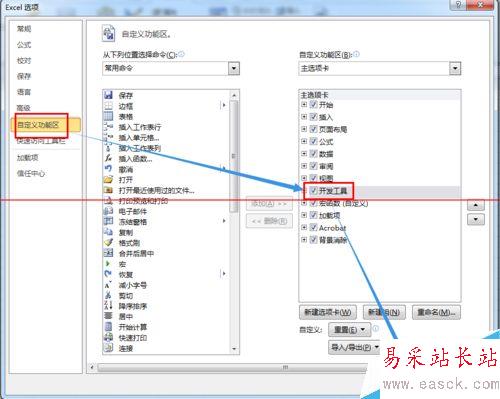 2、EXCEL2010打開方式:點“文件” → “自定義功能區”→ 勾選“開發工具”→ “確定”