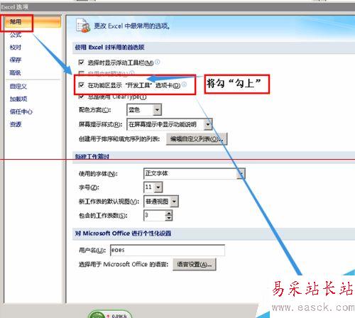 1、EXCEL2007打開方式:點“左上角” → “Excel選項” → “常規” → 勾上“在功能顯示開發工具選項卡” → “確定”