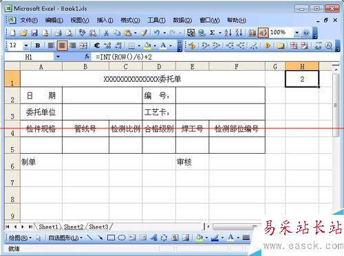 2、在表sheet2的打印區(qū)域后面的列作輔助單元,H1內(nèi)填寫打印數(shù)據(jù)在表SHEET1中的行序號(hào),第一個(gè):2