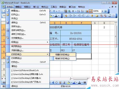 7、設(shè)置打印內(nèi)容,選中打印的內(nèi)容,文件->打印區(qū)域->設(shè)置打印區(qū)域。