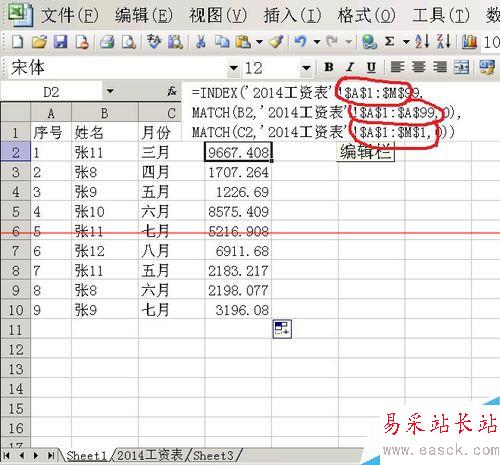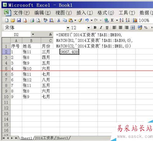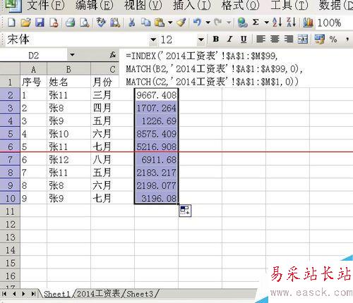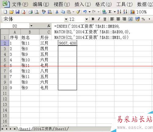3、在單元格D2輸入:=INDEX('2014工資表'!$A$1:$M$99,MATCH(B2,'2014工資表'!$A$1:$A$99,0),MATCH(C2,'2014工資表'!$A$1:$M$1,0))