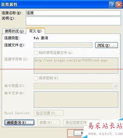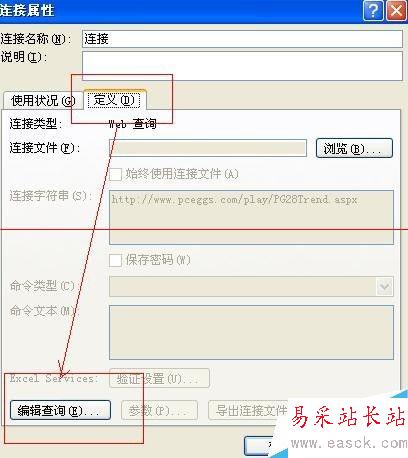5、還是同一個對話框,在“定義”的下面,可以看到我們苦苦尋覓的“編輯查詢”了,接下來就可以打開外部網站,導入想要導入的數據了;
