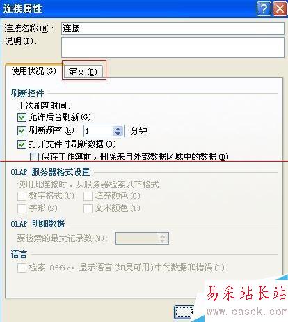 4、接下來是“連接屬性”對話框,找到途中所示的“定義”,點擊打開;