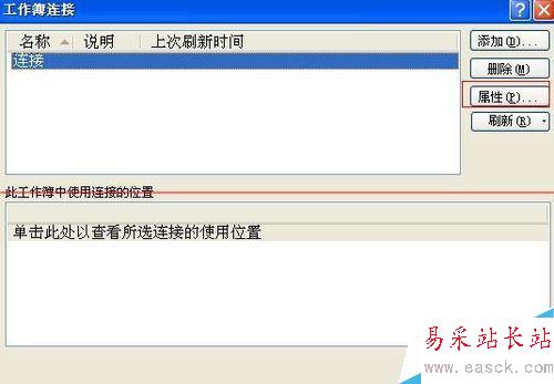 3、在出現的“工作簿連接”對話框,找到右側的“屬性”,打開;