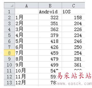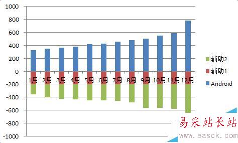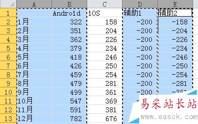 1、如下圖1所示,是本例的原始數據,為了形成對稱的柱形圖,需要添加輔助列,如下圖2所示,輔助列1是一組值為-200的數據,是為了將兩個對比的數據列間隔開的分割輔助數據列,另外一組輔助列是第二列數據的反相數據,目的是形成縱軸上的對比。