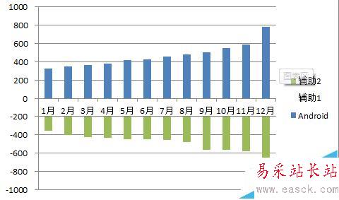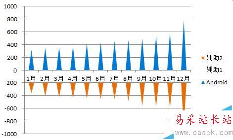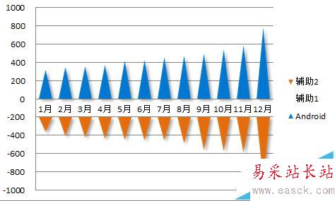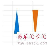簇狀柱形圖通常是用于在兩個數據系列中進行橫向比較,比較的方式是兩個數據點繪制的柱形圖案并排比較的方式,但是這樣的比較方式并不新穎,在一些只需要看趨勢的比較中,坐標軸對稱的比較方式也可以作為一種對比方式,如果采用三角形填充的柱形圖方式展現,會有耳目一新的感覺,本例闡述如何制作這樣一種柱形圖。