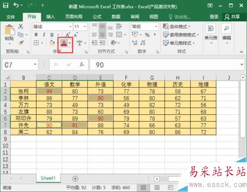6、在字體顏色處選擇顏色,即標記出了90及以上數值,如圖所示