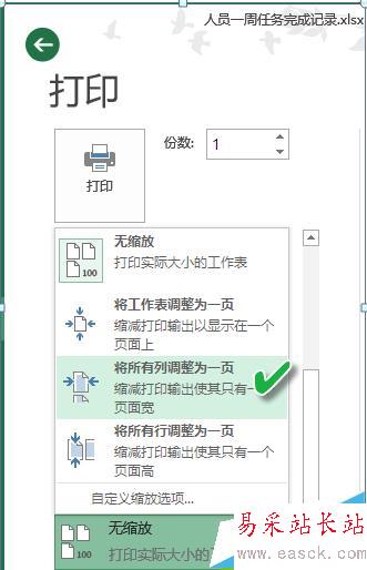 2、其實,這時候我們只需從打印設(shè)置窗口中,把縮放選擇列表中的選項調(diào)整為“將所有列調(diào)整為一頁”,這樣打印時就不會分開兩頁或更多頁打印了。總體速度也提升了