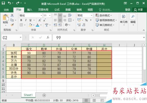 1、制作好表格,統計橫向和縱向分數,如圖所示