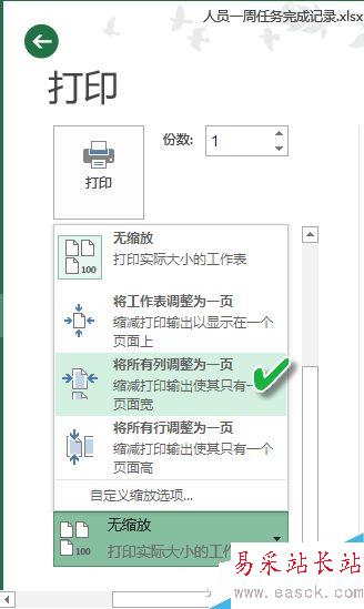 其實,這時候我們只需從打印設置窗口中,把縮放選擇列表中的選項調整為“將所有列調整為一頁”,這樣打印時就不會分開兩頁或更多頁打印了。總體速度也提升了。