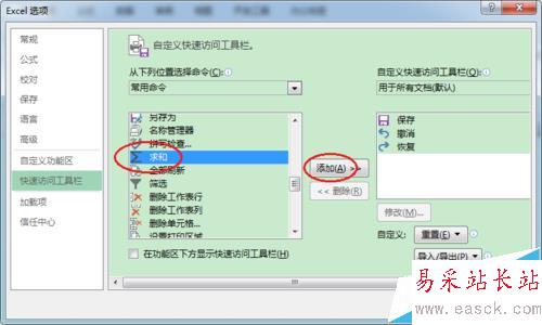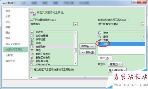 5、最后點擊“確定”按鈕保存,可以發(fā)現(xiàn)窗口最上面的“快速訪問工具欄”上已經(jīng)有“求和”按鈕了: