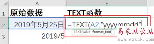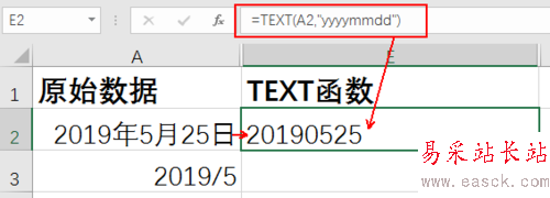 如圖,公式=TEXT(A2,”yyyymmdd”)將“2019年5月25日”轉(zhuǎn)化為文本“20190525”。公式=TEXT(A2,”yyyy年m月”)將“2019年5月25日”轉(zhuǎn)化為文本“2019年5月”。