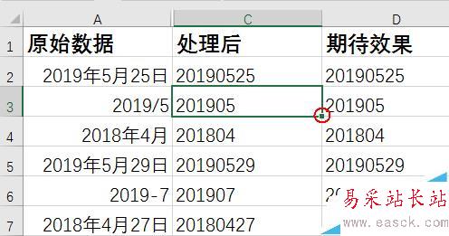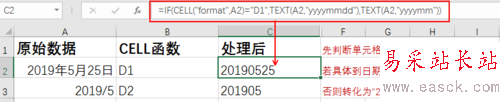 公式=IF(CELL("format",A2)="D1",TEXT(A2,"yyyymmdd"),TEXT(A2,"yyyymm")),先判斷單元格的日期格式,若單元格具體到日期,則轉(zhuǎn)化為“20190525”格式的文本,否則轉(zhuǎn)化為“201905”格式。